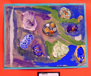 Our first graders just completed these artworks, where they not only learned about texture (the way things feel!), but also learned some basic color theory. First, they used items found in their art boxes to create seven or eight different textures with Model Magic.